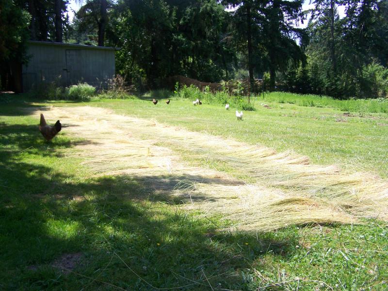 this is after the seeds have been harvested, and is called "dew retting", we turn the flax every 3-5 days until the stems are retted.